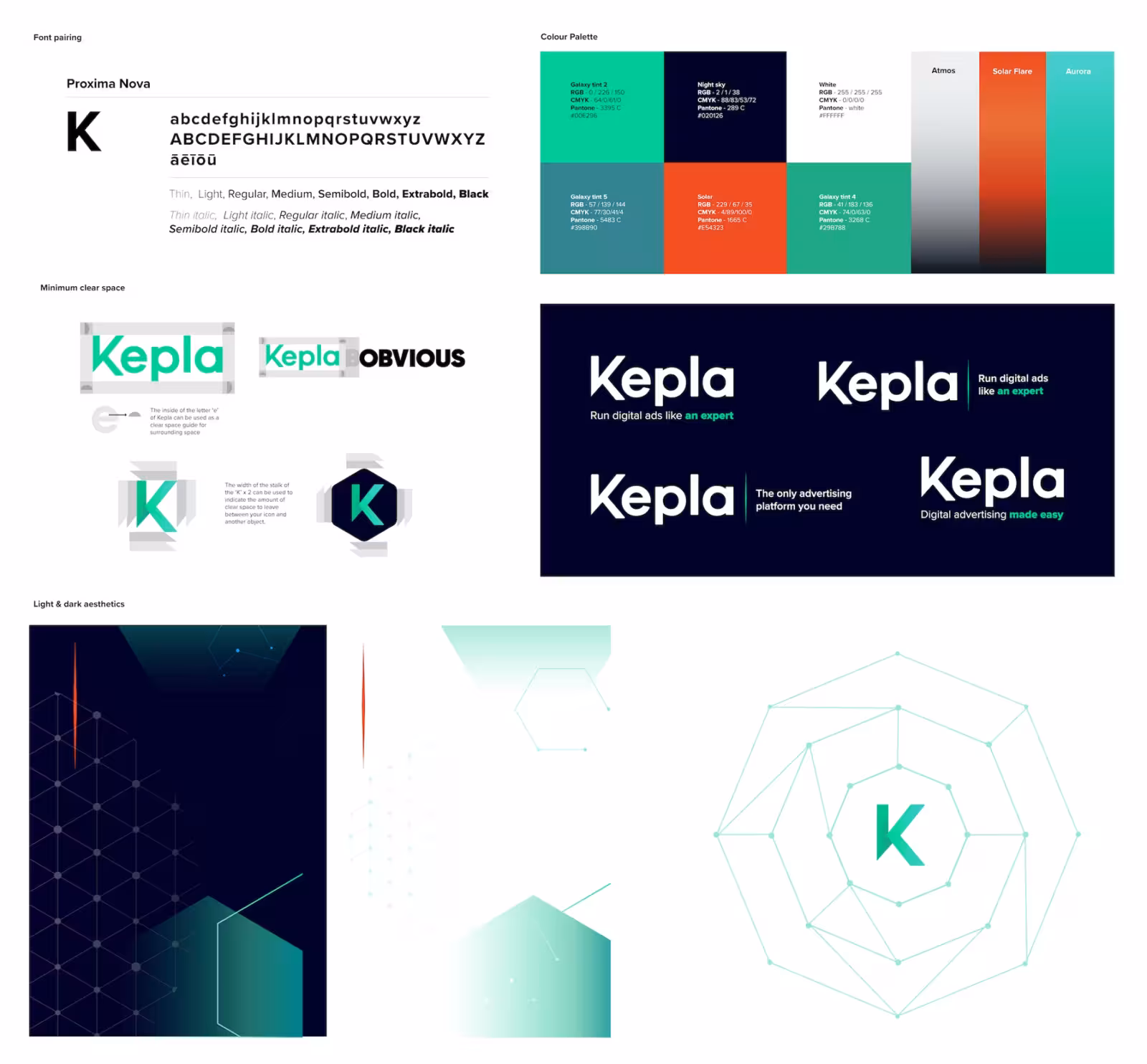 Through our research we determined that the vibrant green would stand out, had positive connotations, felt friendly and engaging whilst also aligning with a galaxy aesthetic and the idea of network growth that we could pull further colour inspiration from. The final palette provides a range of contrasting colours that enable both dark and light aesthetics to appear friendly and engaging both throughout the platform itself and brand and marketing material. The use of contrasting colours allows for versatile application across Kepla reporting and analytics whilst staying within the intended colour scheme.