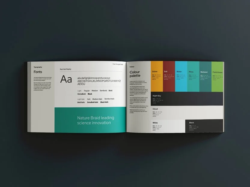 To round off the Nature Braid project we created a brand book. A comprehensive guide that outlines the key elements of a company’s brand identity, including its mission, values, personality, and visual and verbal guidelines. It serves as a tool for ensuring consistency and cohesiveness in all of an organisation’s communications and marketing efforts.