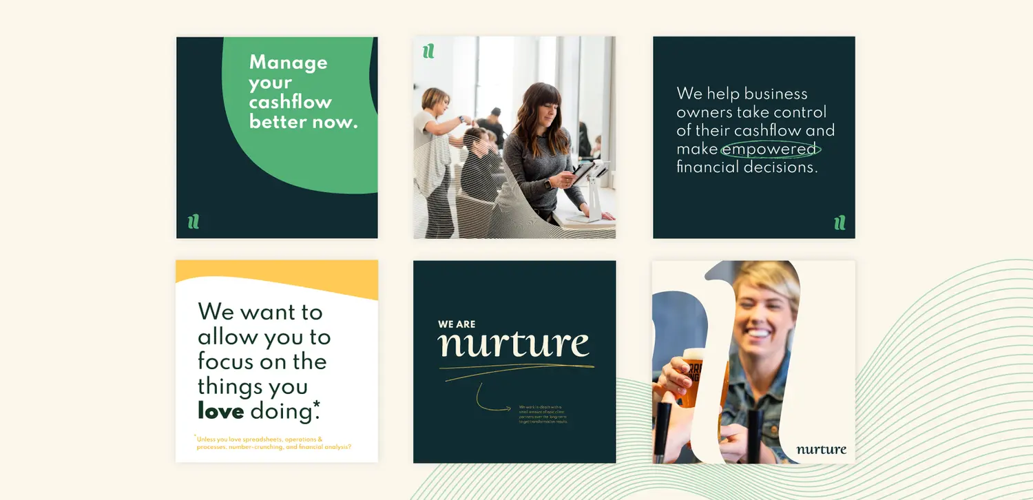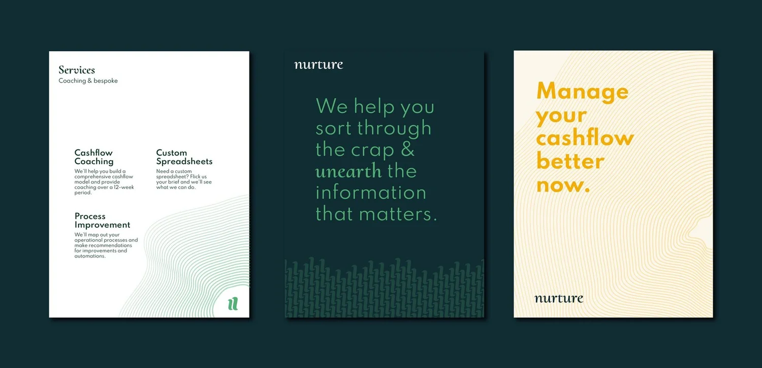 Following our collaborative design framework, we developed a rich visual identity that truely reflects the team behind Nurture as people who care and ensure their clients feel secure and guided in their capable hands.