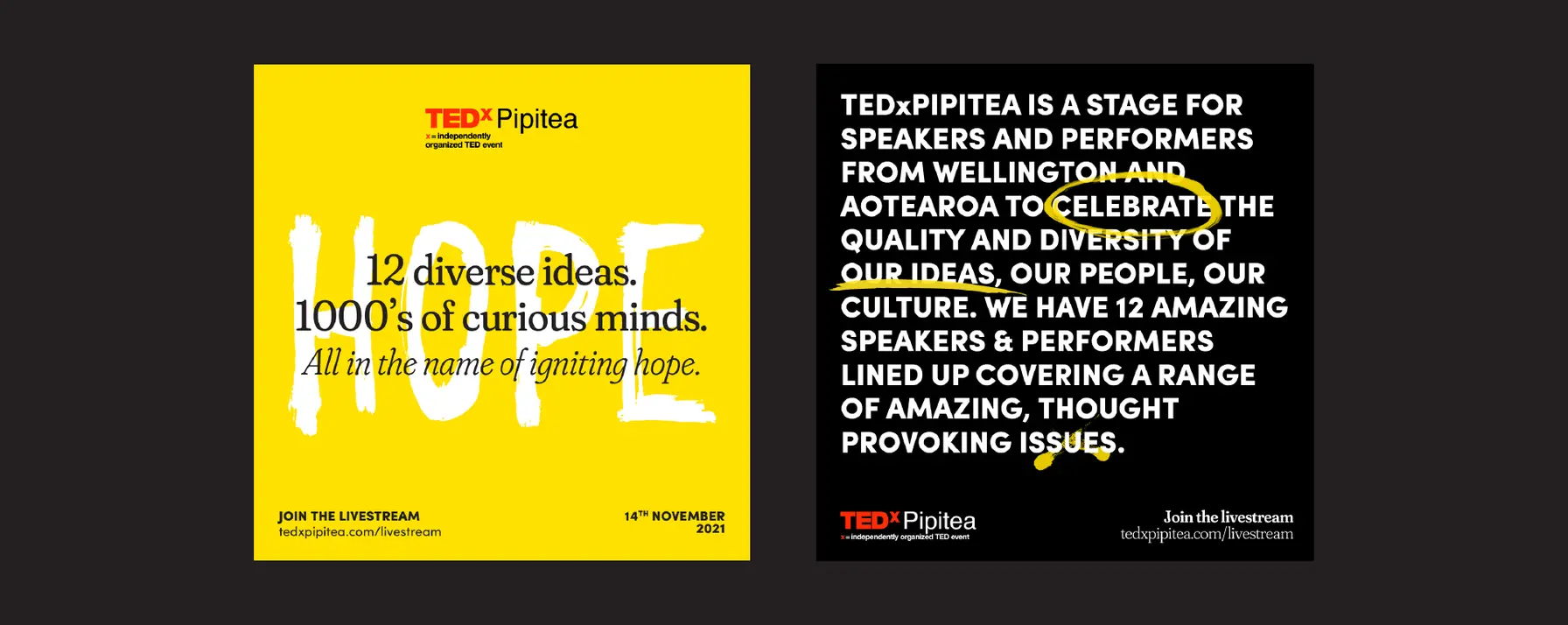 We empowered our speakers, promoters, partners, volunteers through a carefully curated work of design that highlights the essence of TEDxPipitea and what Hope could mean to each individual. And we did this through a multi-faceted campaign that saw our creative applications of Hope to be malleable and adaptable across various media, serving various objectives.