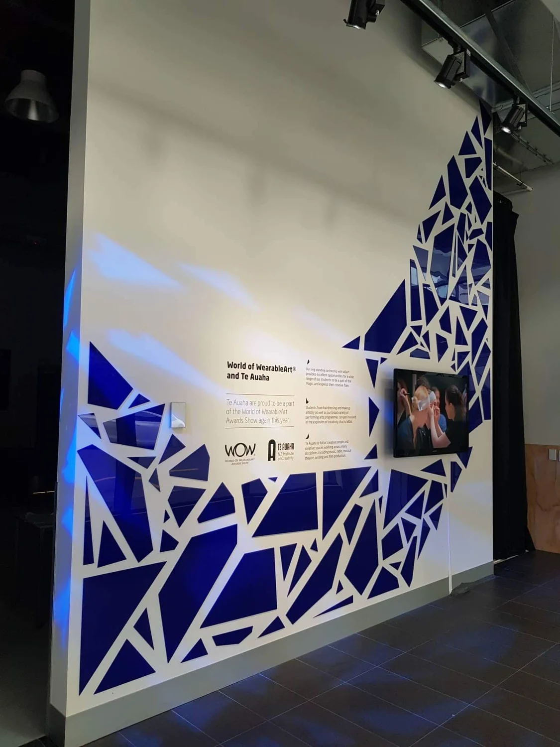 This exhibition at Te Auaha hosted two of the previous years’ garments (from 2016 and 2017) as part of WOW Wander’s city-wide map of historic garments that were on display at various locations in Wellington. In line with the 30th anniversary’s theme, the mural appears alien, provoking the curiosity of pedestrians on the corner of Cuba Street and Dixon Street, with animated lighting on its fragmented, reflective surfaces.